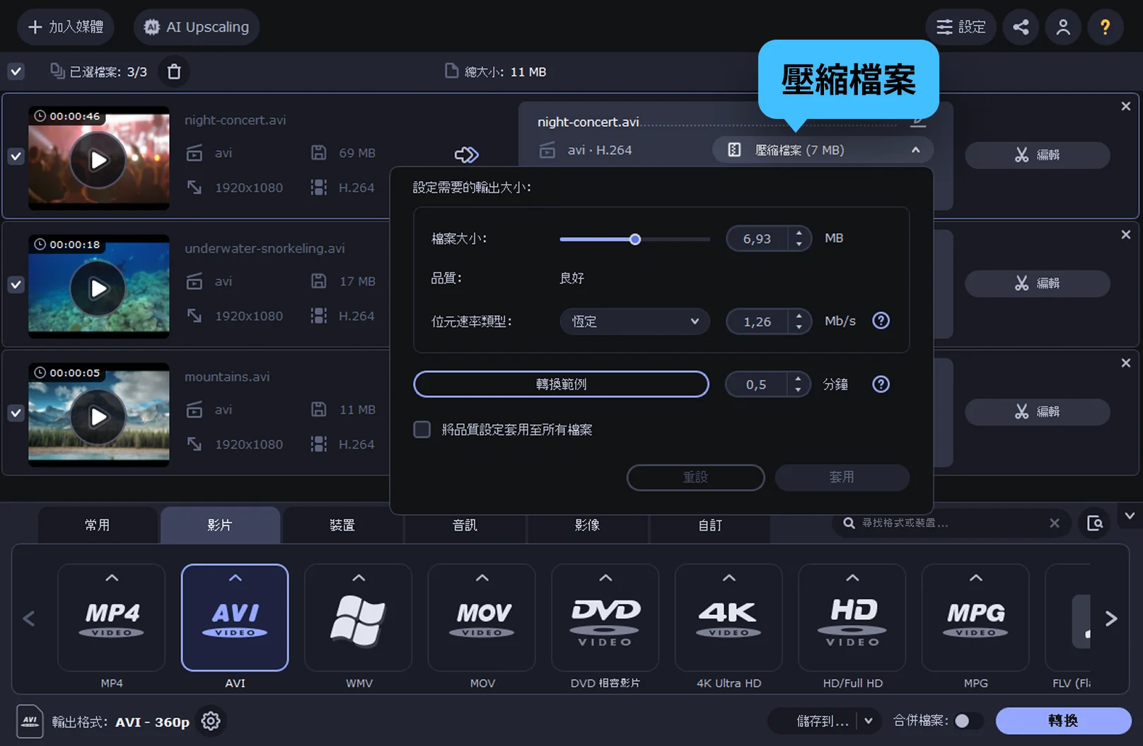 視窗下方亦可選擇輸出格式與壓縮設定。我可依類別做篩選,包括:裝置、影片或音訊等。例: 可將AVI轉為MP4或MKV等,調整位元率、解析度、編碼格式,以實現最佳縮小效果。