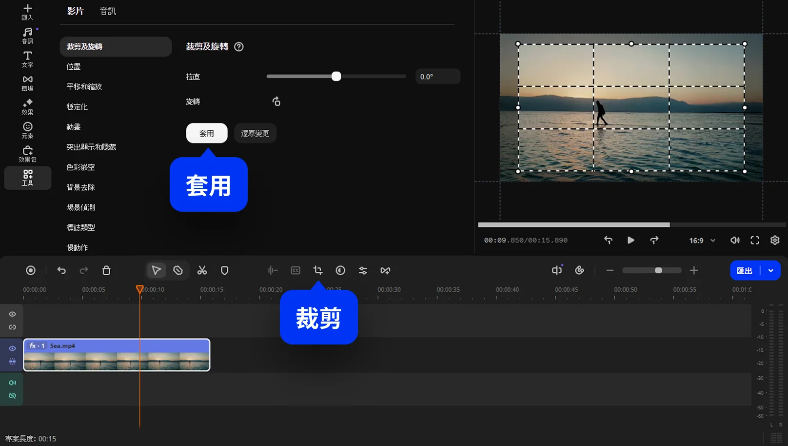 點擊工具列中的裁剪工具,手動調整裁切範圍,精準控制您想要的畫面比例與構圖。調整好裁切範圍後,點擊套用以儲存變更。