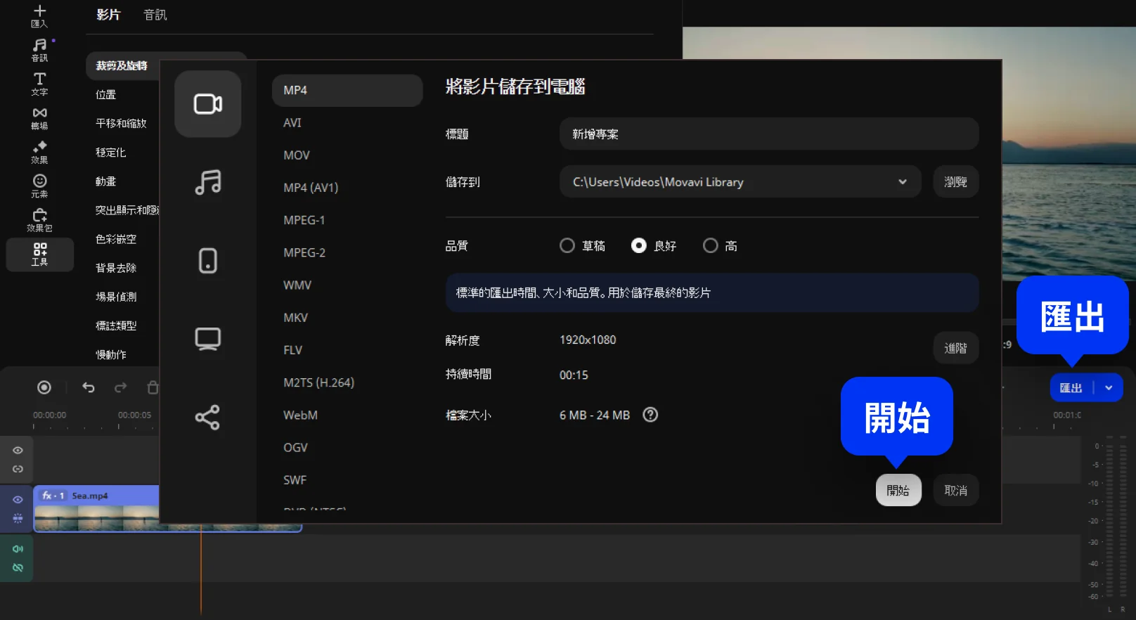 完成編輯後,按匯出即可選擇輸出格式與解析度,再按開始,裁切好的影片就會儲存到您的電腦中。