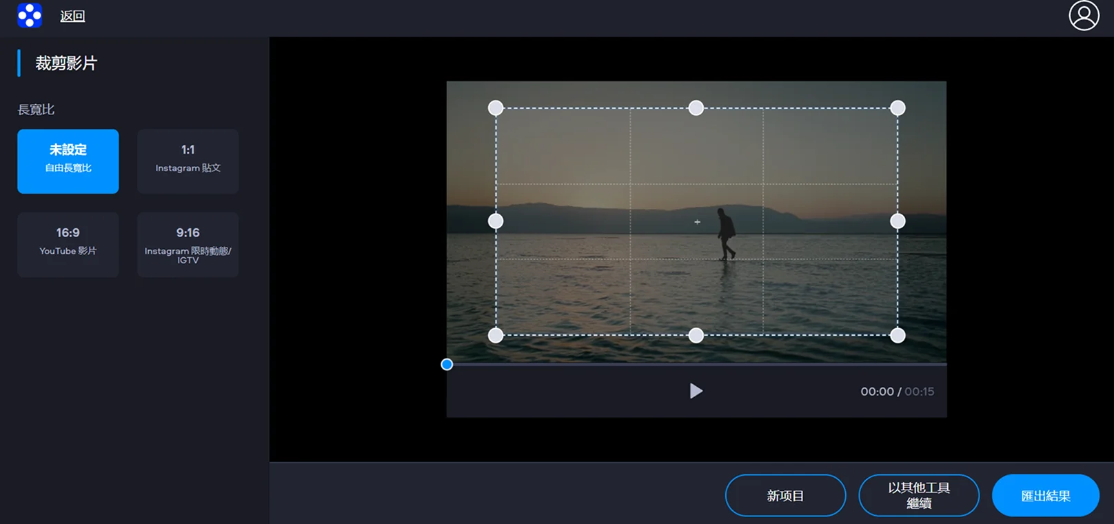 影片載入後,可以選擇適合的畫面比例,或直接拖曳裁切框的四個角調整,將不需要的畫面排除在裁切範圍外。