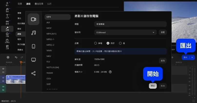 完成翻轉設定後,點擊匯出,會跳出視窗讓您選擇輸出格式、解析度等,按下開始後軟體就會自動匯出處理完成的影片檔。