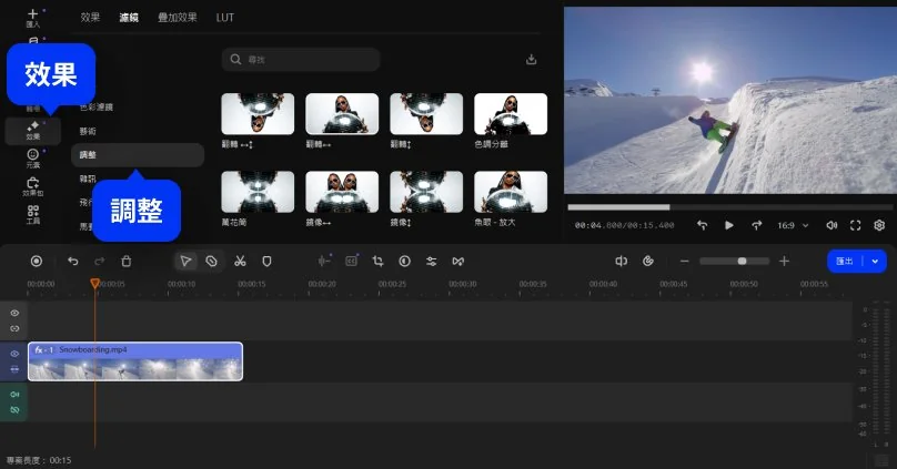 將需要翻轉的一支或多支影片往下拖曳至時間軸,開啟視窗最左側的效果標籤,然後選擇調整,就能看到翻轉的功能,可以選擇左右翻轉 [翻轉↔] 或上下翻轉 [翻轉↕]。若影片方向不正,也可先進行旋轉調整,再完成翻轉設定。