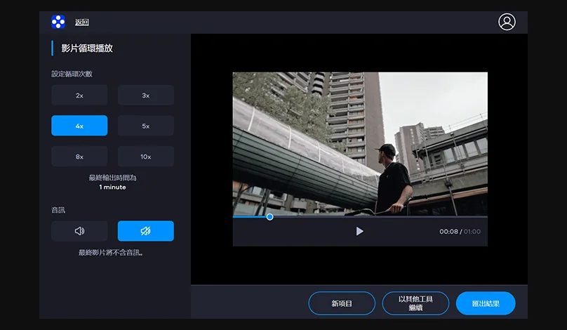 影片上傳後,您可以設定影片循環播放的次數,決定片段要重複幾次。也可以針對特定片段進行剪接,設定循環播放的區間。如果需要,也可以將影片音訊關閉,設為靜音。