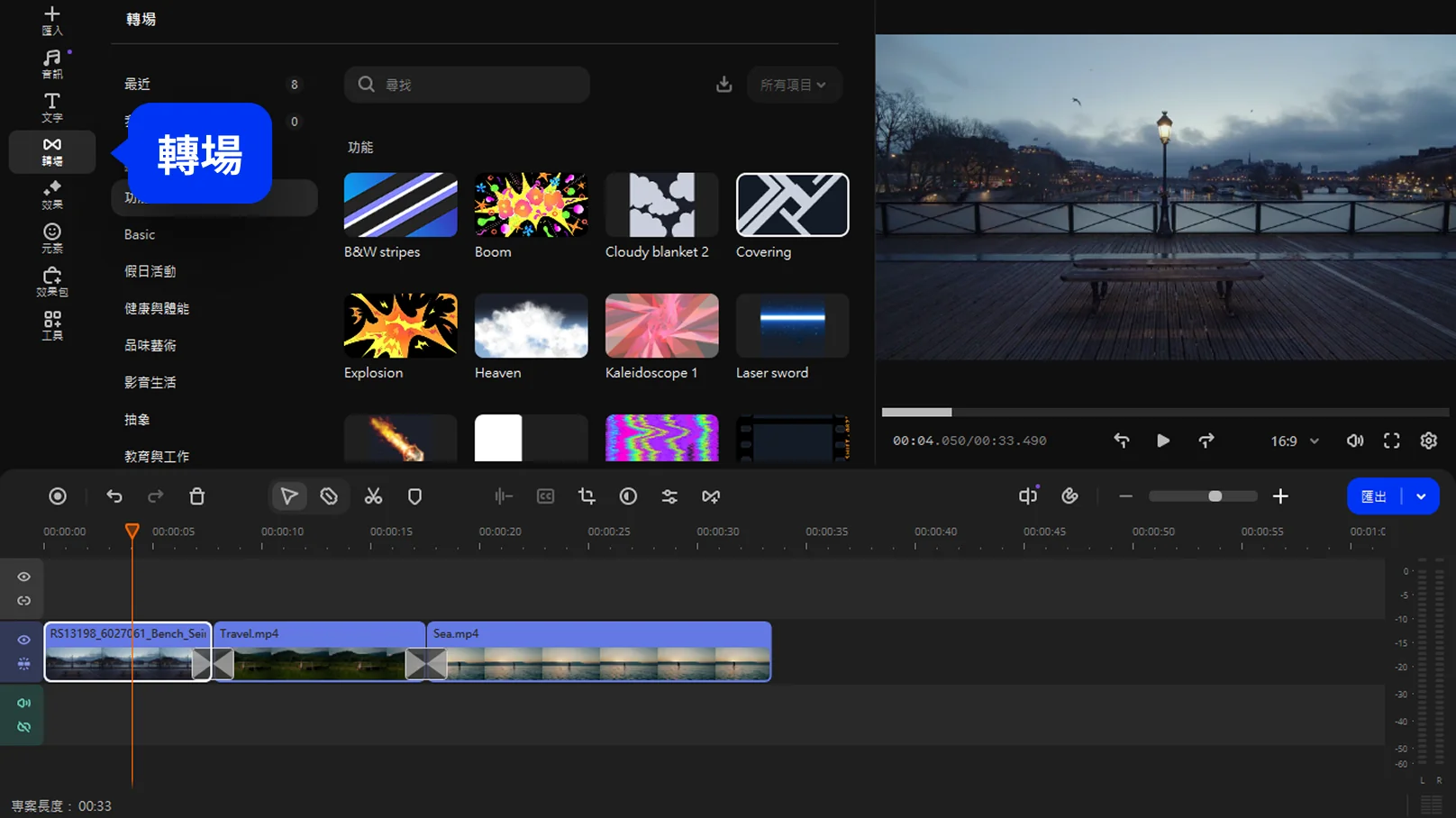 將影片拖曳至時間軸上,軟體會讓影片自動首尾銜接。接著我可自由拖放以調整最佳順序,或在片段間加入轉場與特效,使影片組合更自然。