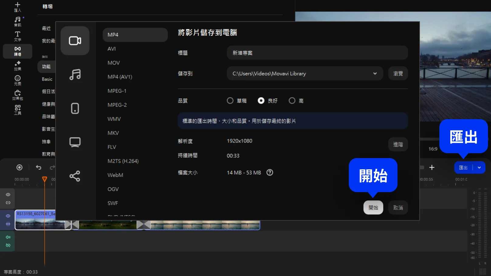 完成剪輯後,我只要點擊「匯出」,選擇輸出格式、解析度(建議 MP4格式)與品質等,設定儲存位置後開始處理,即可獲得完整作品。
