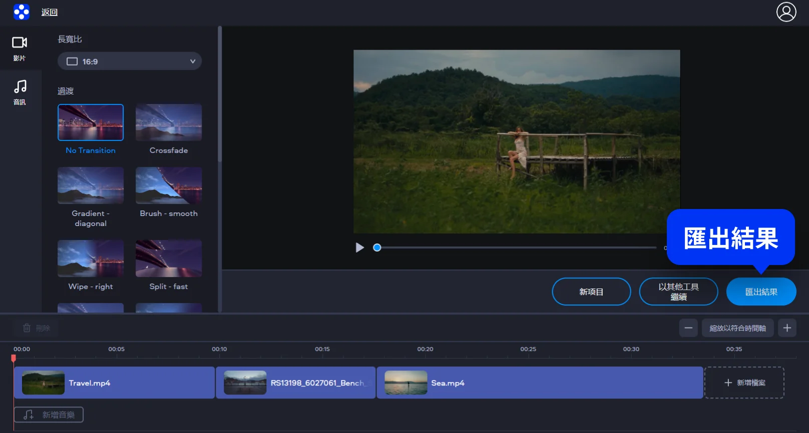 檔案上傳完成後,影片會依序顯示。操作者可直覺地透過拖放方式改變呈現順序,必要時還可進行基本剪輯、加入過渡效果、改變長寬比等。我在過程中可馬上裁切片頭或片尾,調整影片結合的流暢度。
