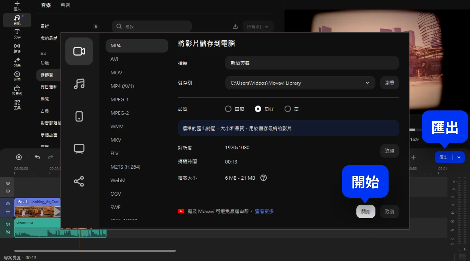 完成剪輯後點擊「匯出」,選擇影片格式與解析度。我特別欣賞它內建的轉檔功能,不論片源為何,處理後會輸出成指定的單一種影片檔格式。若欲上傳社群平台,通常會輸出為 MP4。