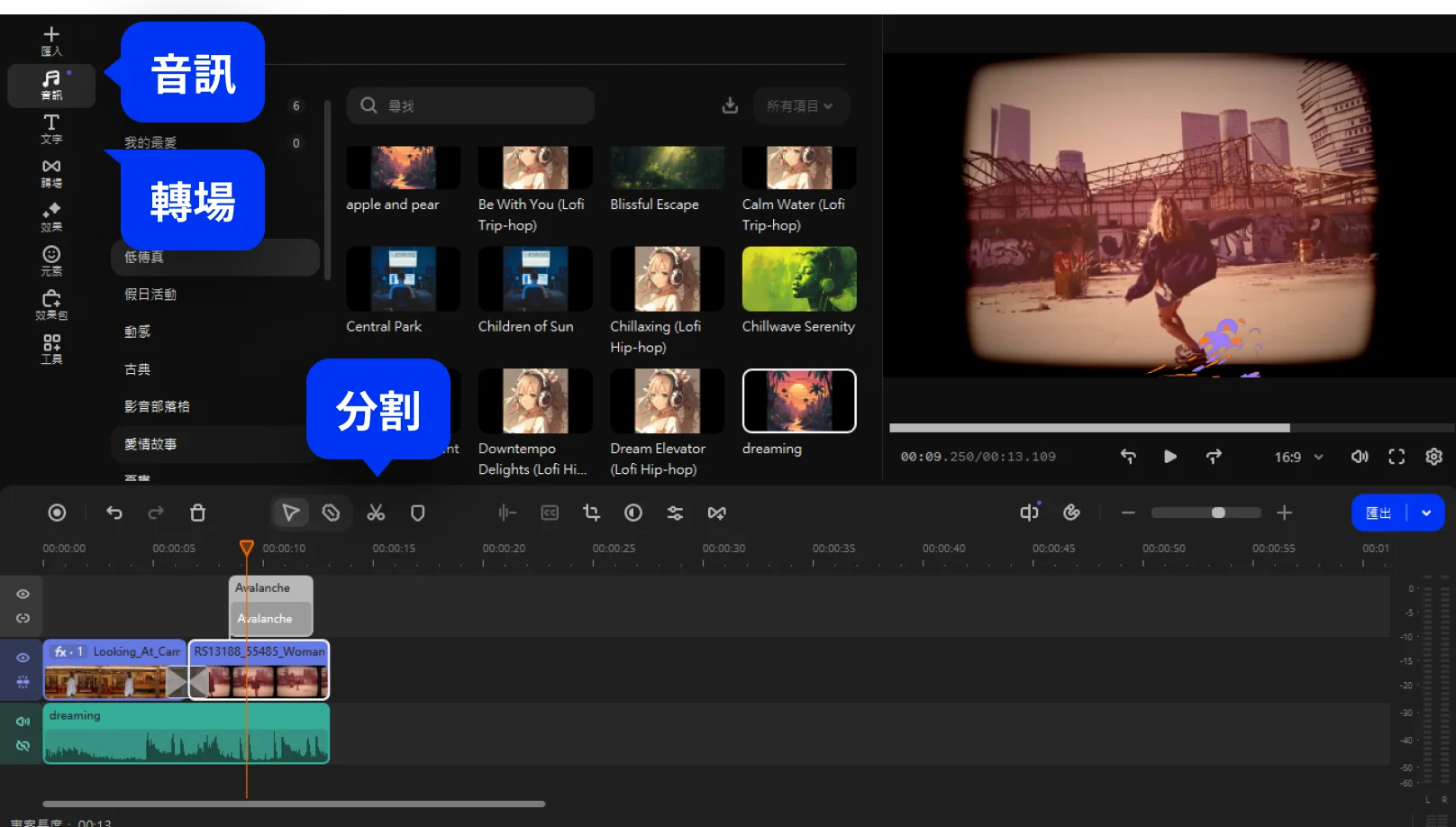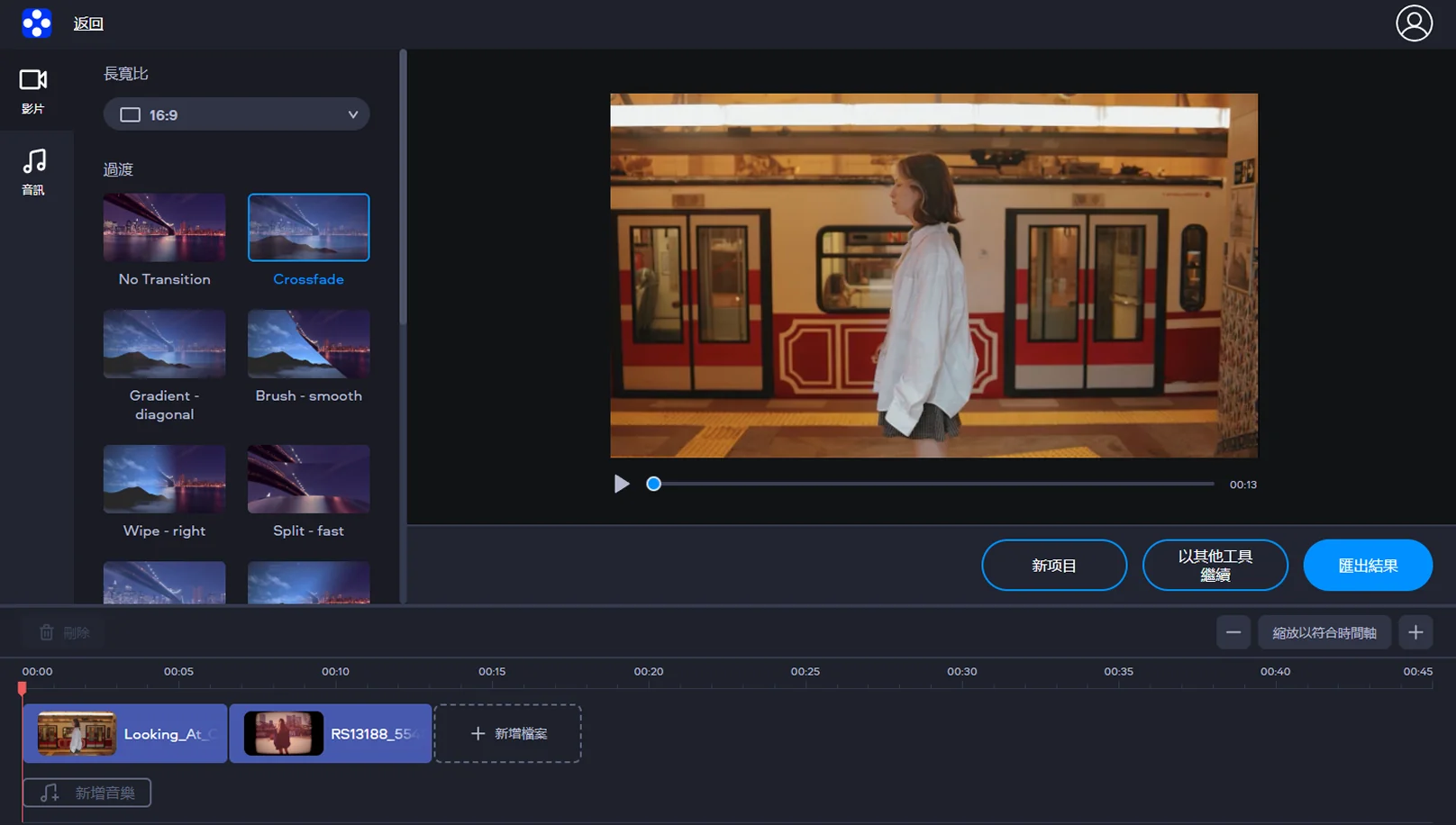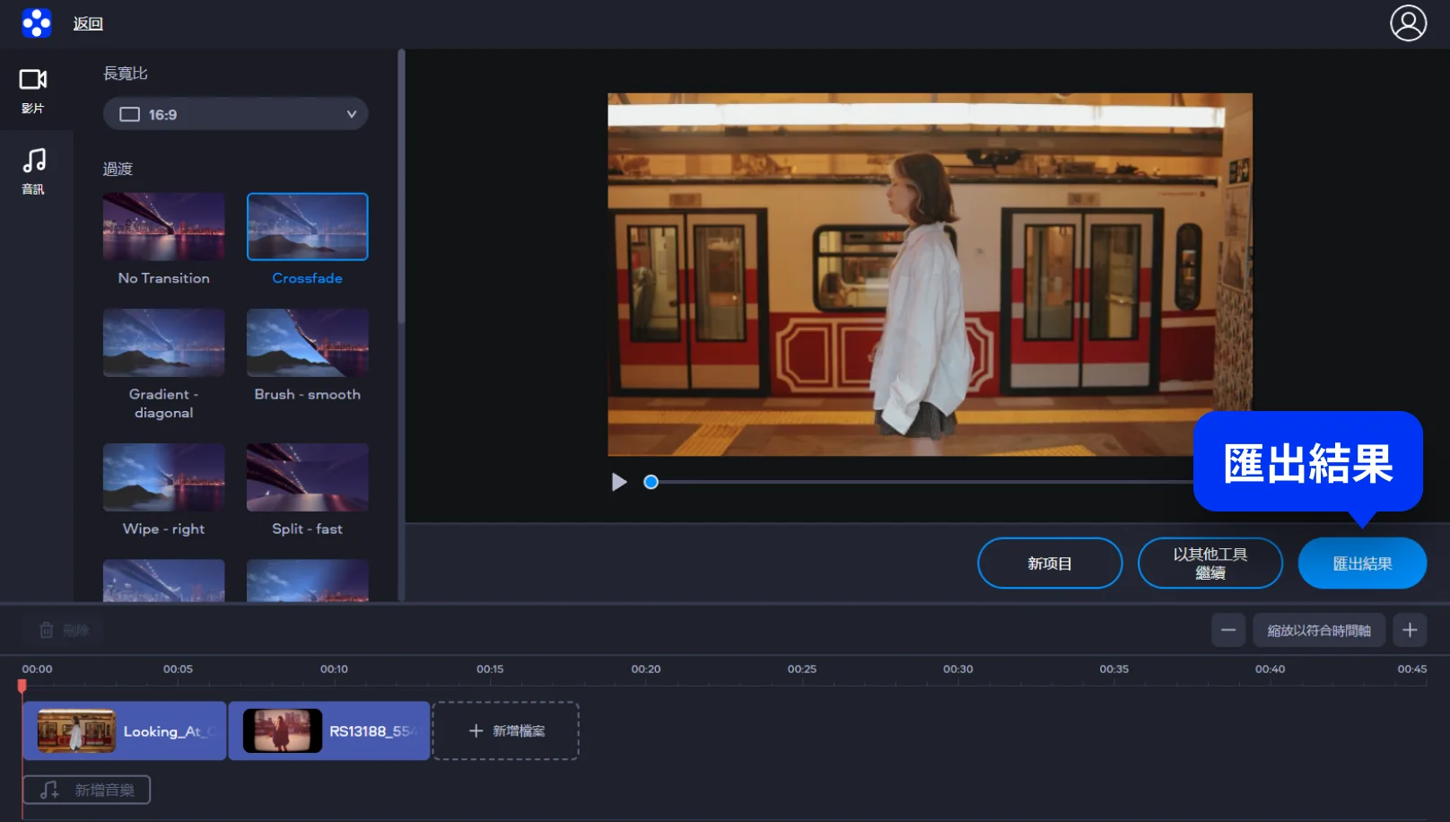 改變影片順序: 拉動影片可對調前後位置。插入過渡: 在 15 種轉場中選一種。長寬比: 若需要在社群貼文,可調整最佳尺寸為YouTube(16:9)、Instagram限動(9:16)、Instagram貼文(1:1)、LinkedIn(4:3)、垂直(3:4)。添加音樂: 可上傳自己的MP3或選擇內建音樂庫(數十種)。有需要可調整音量做最佳混音,或修剪過長的音訊長度。