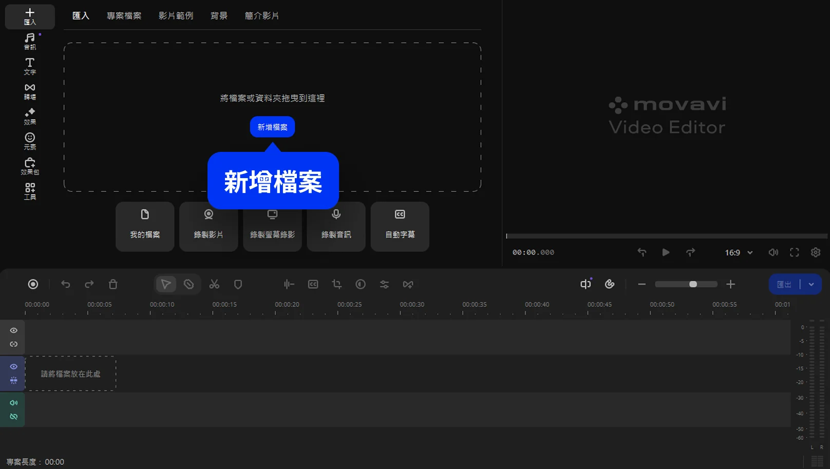啟動 Movavi Video Editor 後,點擊「新增檔案」將影片匯入媒體庫。本軟體支援多種影片格式,例如 MP4、MOV、MKV、AVI 等,讀取相容性高。