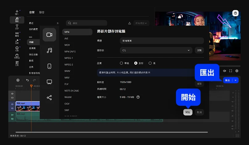 確認影片已完成消音處理後,點擊匯出,再依需求選擇適合的輸出格式以及儲存位置,或選擇直接上傳到網路上也可以,然後按開始,就能將影片匯出成最終檔案。