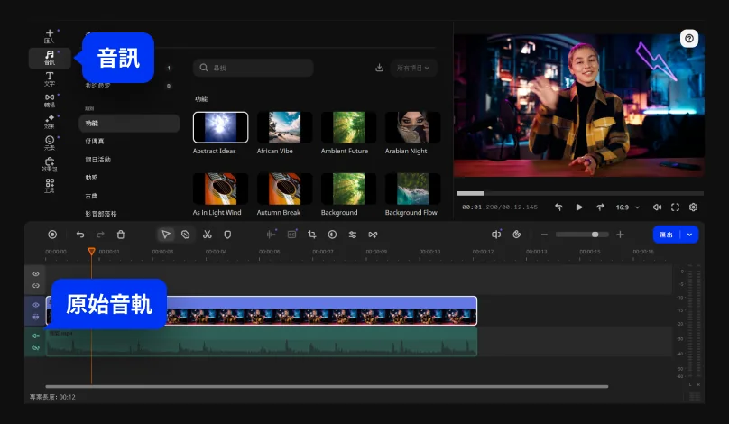 這時,如果您還想進一步在已消除聲音的影片中,另外加入其他的背景音樂,可以前往音訊索引標籤,打開音樂,然後將您喜歡的音軌拖曳至時間軸上放置即可。