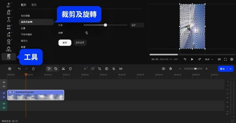 選取欲編輯的影片,將其拖曳至下方的時間軸。拖下去後,影片就會被黃色外框包圍,表示這些影片是目前的主要編輯對象。點選「工具」> 「裁剪及旋轉」。點選「旋轉」,每點擊一次圖示就會順時針轉90度,點擊兩次就是180度,依此類推。
