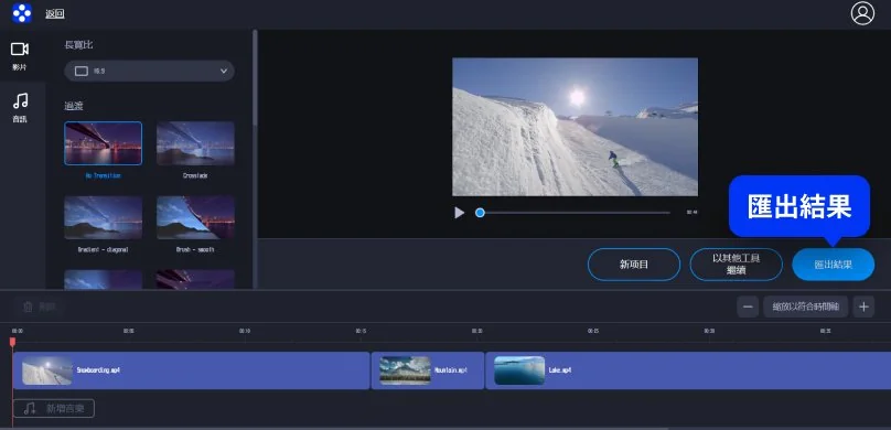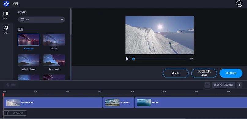 照片和影片都上傳後,可以在時間軸上拖曳調整檔案順序,並在介面上方選擇每張圖片顯示時間、長寬比、轉場過渡方式,還可以選擇加入背景音訊。透過音樂搭配與畫面排列,即可完成基本的照片輪播影片。