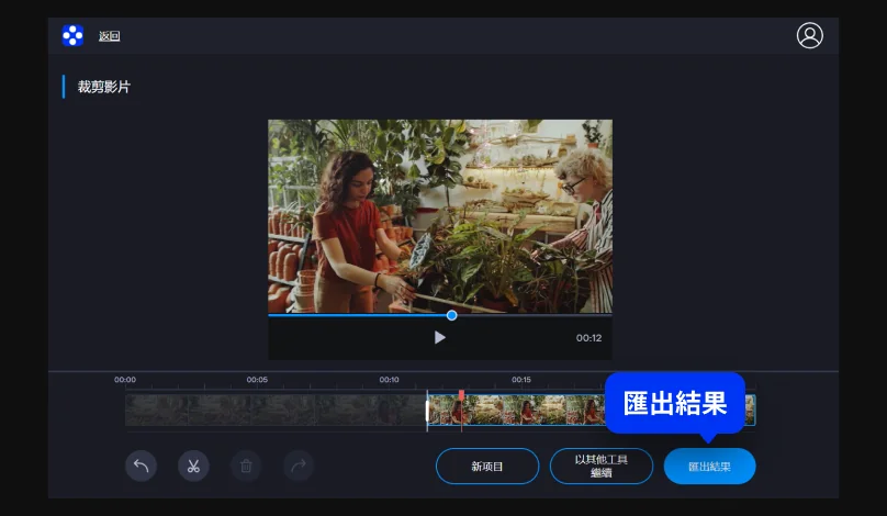 設定片段起點(指示器圖示)、進行剪切(剪刀圖示)、設定片段終點(指示器圖示)、刪除所選片段(剪刀圖示)、撤銷或重做(箭頭圖示)。依序操作就能完成分割影片,需要影片分段輸出或刪減內容都超直覺。若想用其他影片分割軟體功能,可點「以其他工具中繼續」;完成後按「匯出結果」,Movavi 將自動去間隙並合併。