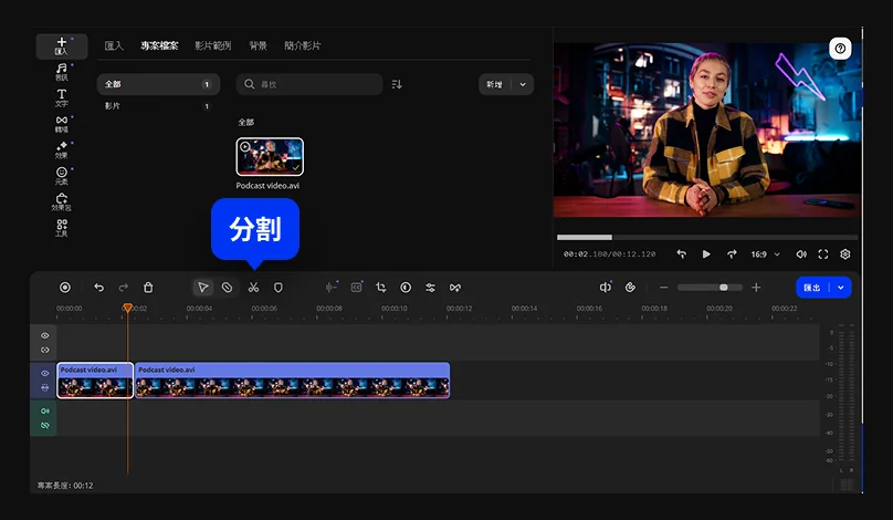 先在起點切割影片,再於終點切一次,選取中段刪除後讓前後片段手動或自動銜接,最後匯出即可,這是最基礎的分割影片方式。