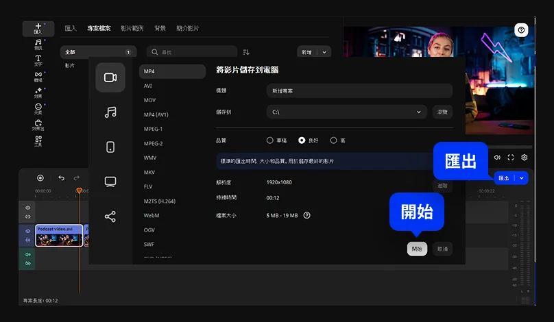 完成後按「匯出」,選擇格式(支援MP4、AVI、MKV等,推薦MP4)、解析度與品質。這些設定會影響處理時間與最終影片檔大小;若要分享,我通常選高品質。設定儲存位置後按「開始」,即可完成輸出。